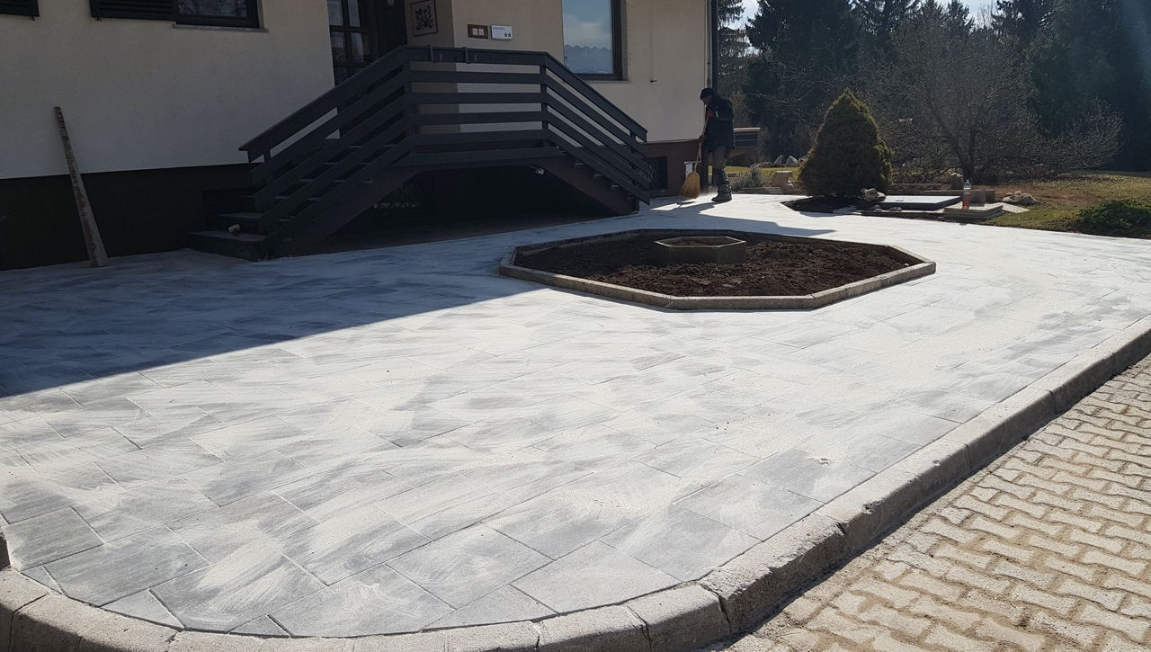 Polaganje tlakovanih poti in dekorativnih elementov – ustvarjanje funkcionalnih in estetsko dovršenih vrtnih poti in površin.